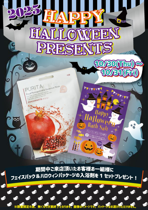 10/30.31日の期間中にご来店いただいたお客様お1組様につきおひとつ フェイスパックとHW入浴剤のセットをプレゼント!!