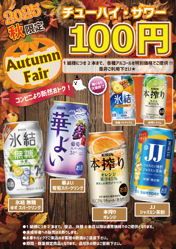 夏季に大好評だったチューハイ・サワーフェアを、秋バージョンに一新しサービス開始しました!秋にピッタリなフレーバーを100円の超お得価格でお楽しみいただけます♪